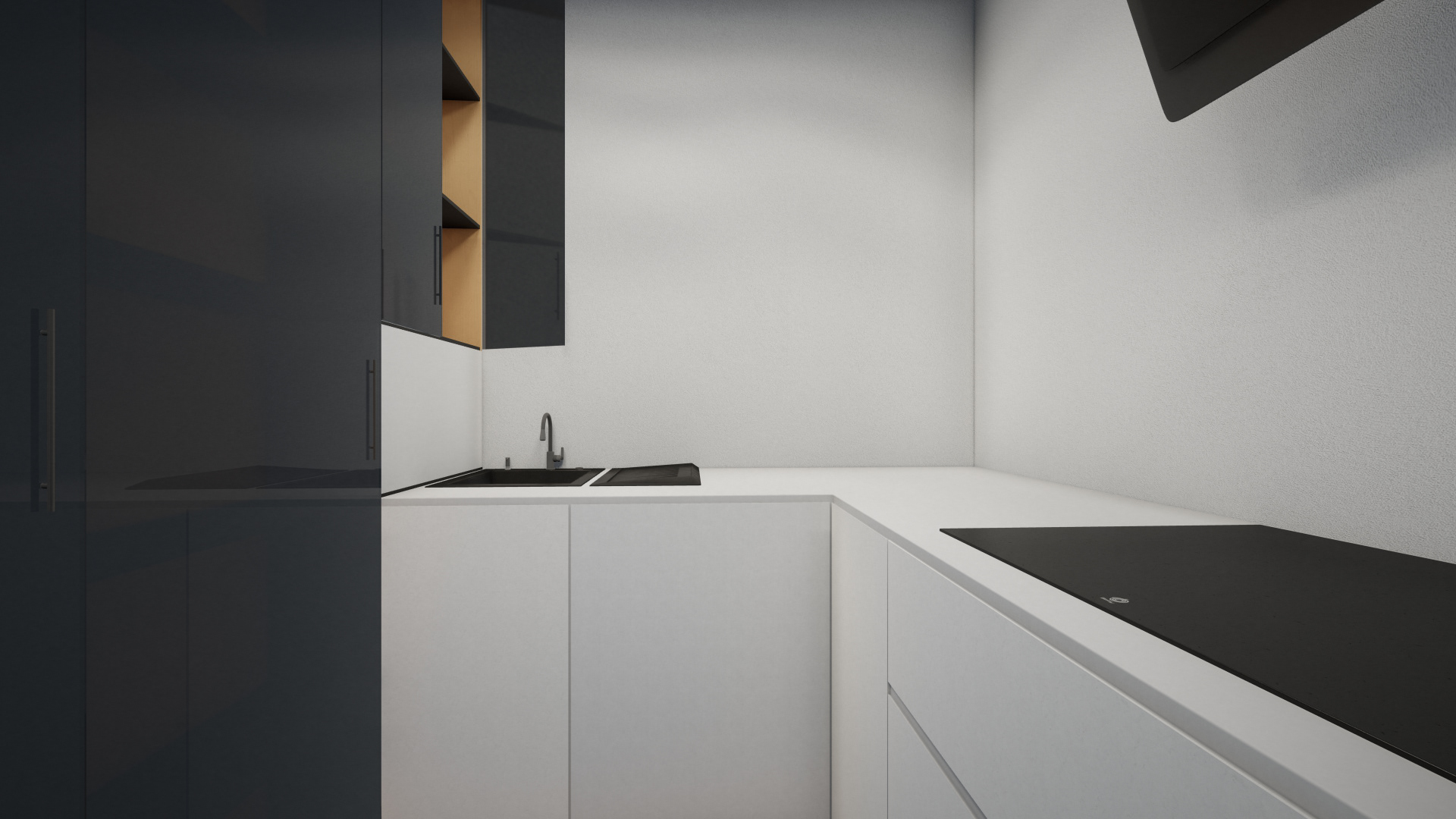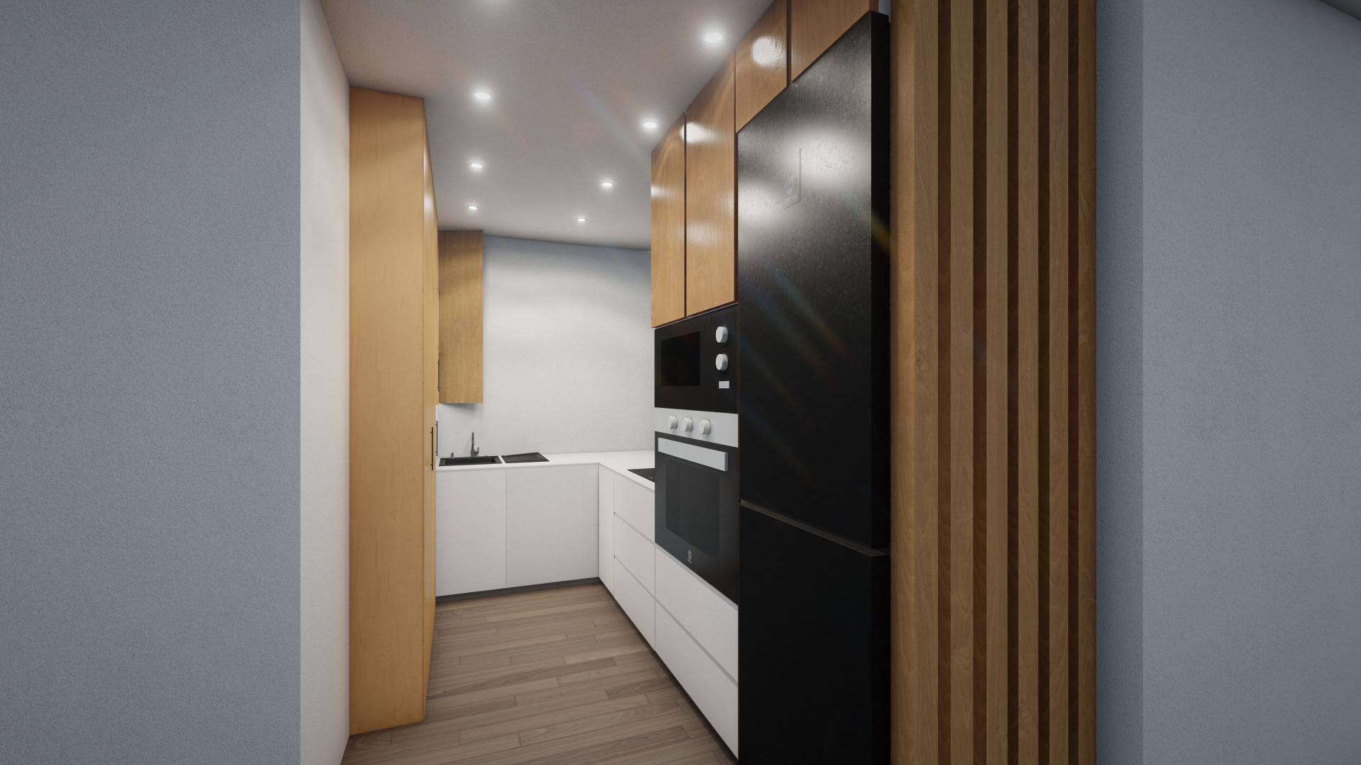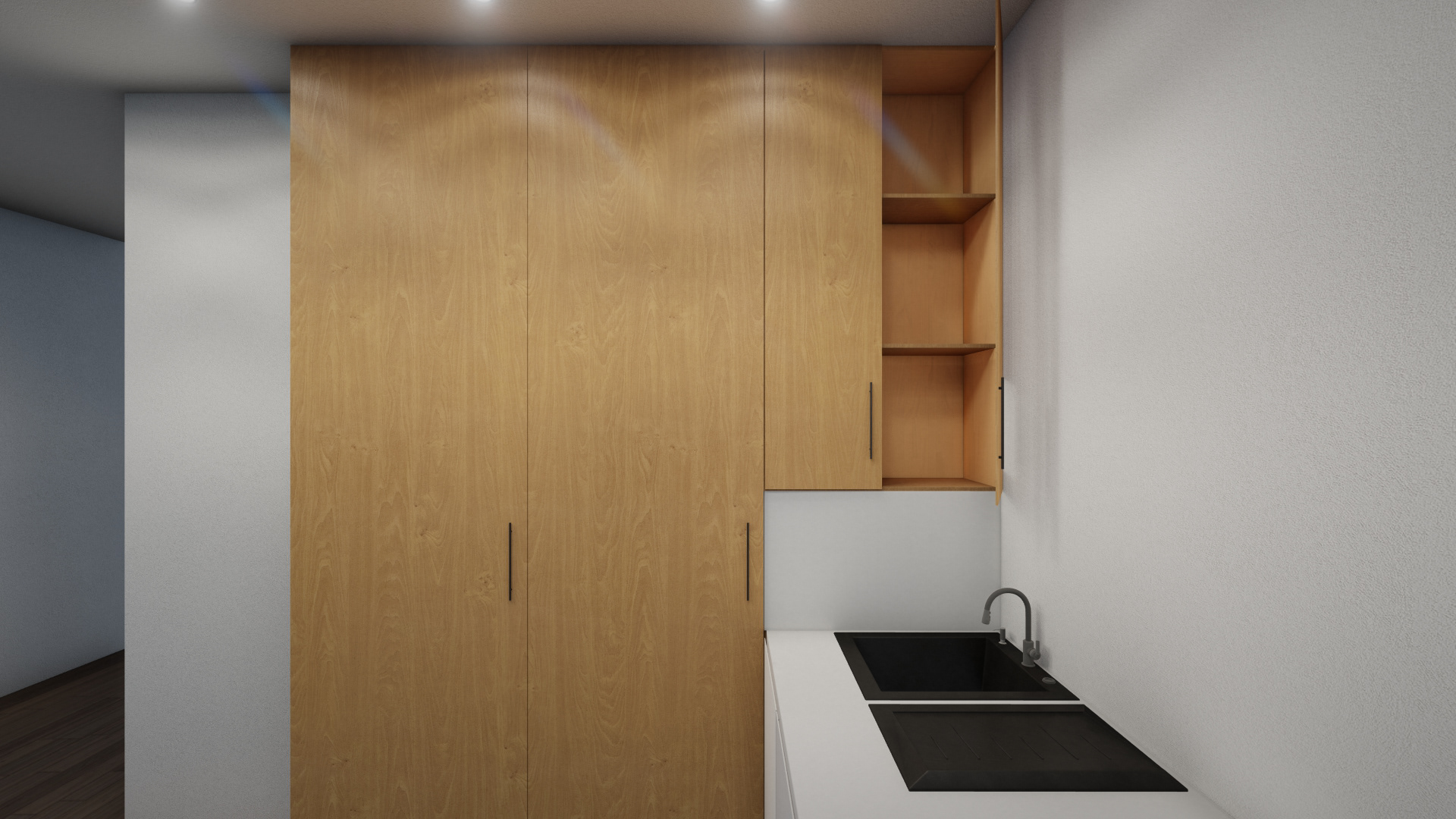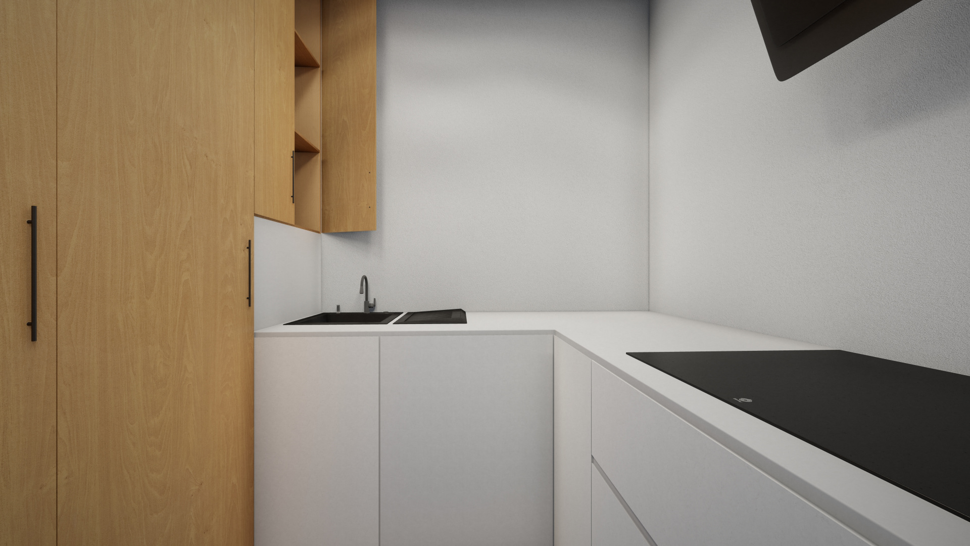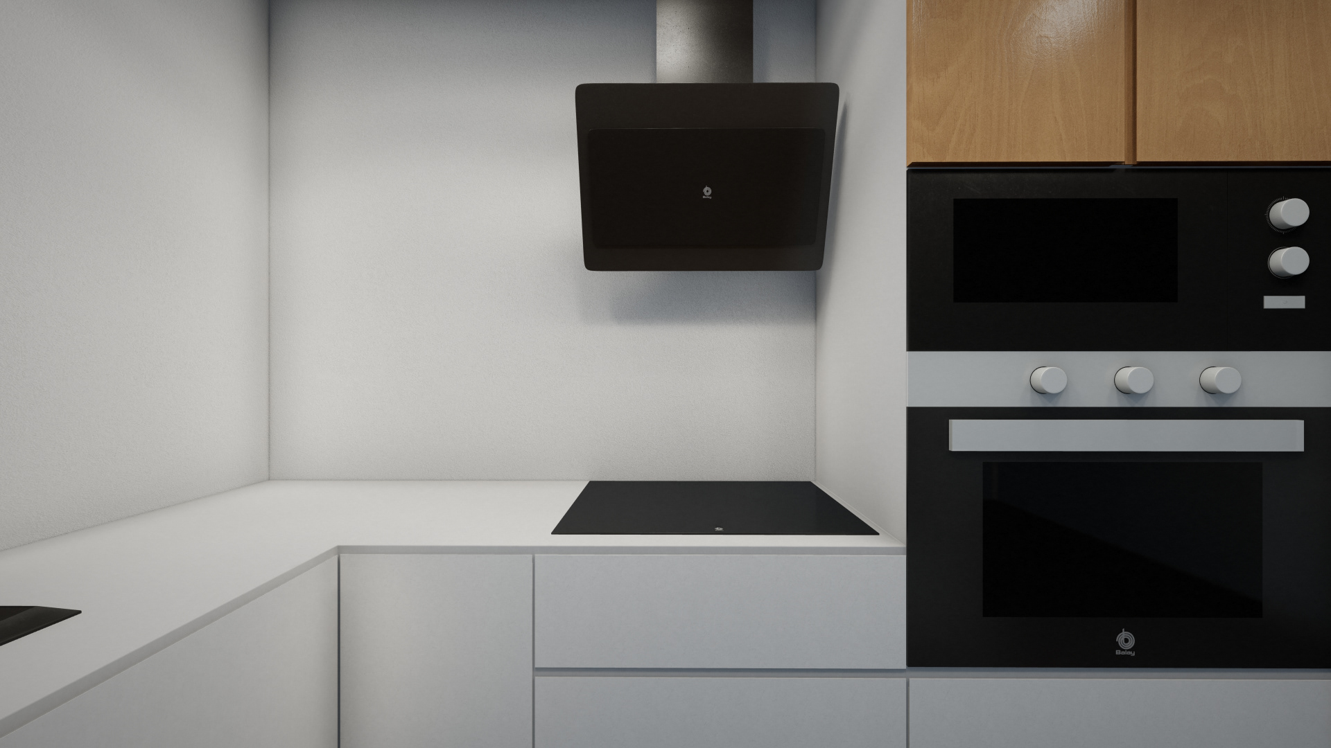 Modern kitchen finished in oak, marble and cabinet doors in tempered glass or wood. All models handcrafted in Maya 3D and imported into Lumion 12. Interior modeled with Balay appliances.